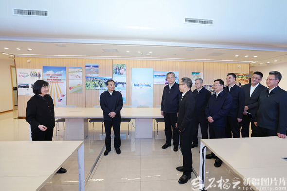 11月7日,自治区党委书记、兵团党委第一书记、第一政委陈小江在新疆日报社,察看新疆国际传播中心运营成效。石榴云/新疆日报记者崔志坚摄