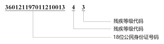 第五条 残疾人证号全国统一编码,首次办证采用20位编码格式,以公民身份号码和残疾类别、残疾等级代码为基础,由18位公民身份号码加1位残疾类别代码和1位残疾等级代码组成,如: